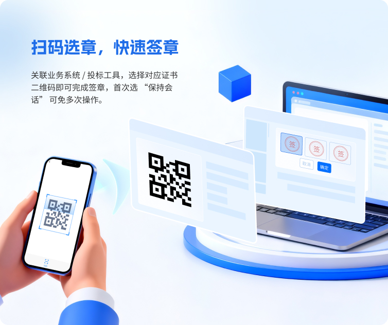 关联业务系统/投标工具,选择对应证书二维码即可完成签章,首次选“保持会话”可免多次操作