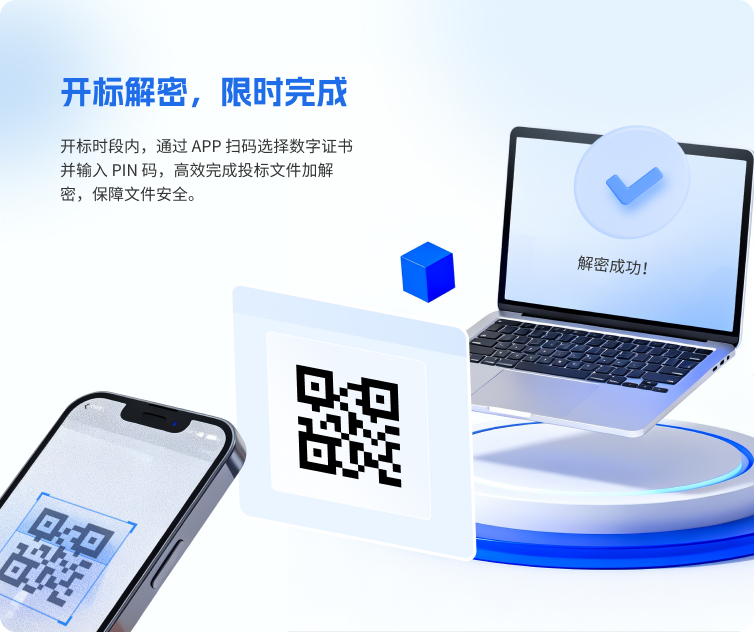 开标时段内,通过 APP 扫码选择数字证书并输入 PIN 码,高效完成投标文件加解密,保障文件安全