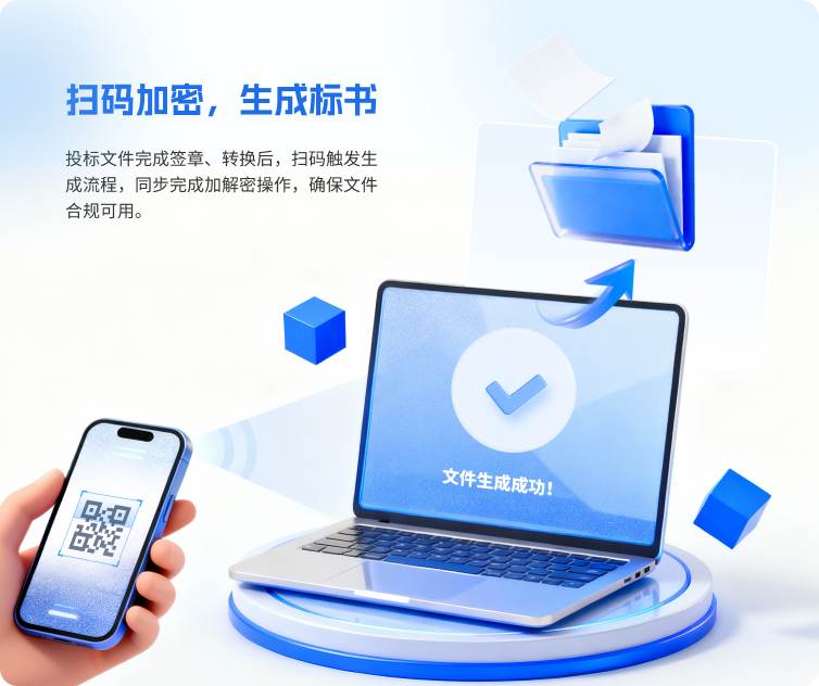 投标文件完成签章、转换后,扫码触发生成流程,同步完成加解密操作,确保文件合规可用