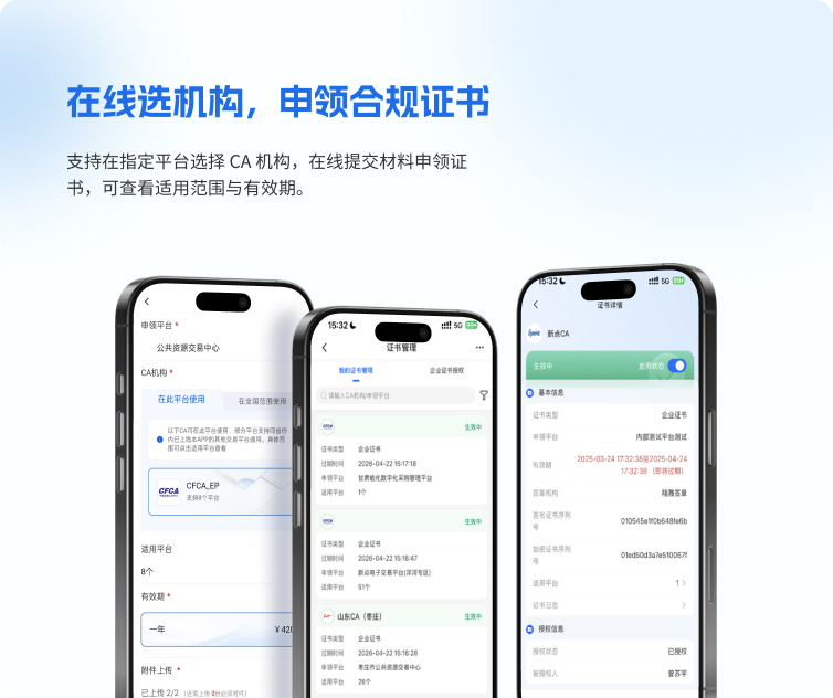 支持在指定平台选择CA机构,在线提交材料申领证书,可查看适用范围与有效期